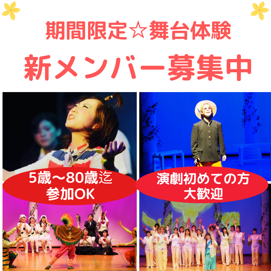 一般公募で集まった(5歳~80歳迄)メンバーと期間限定(8カ月~10ヶ月)で、1本の作品を仕上げ、公演上演後に解散する、市民参加型の「期間限定(体験型)劇団」です。普段出会う事のない、幅広い世代のメンバーと楽しみながら舞台に出演!